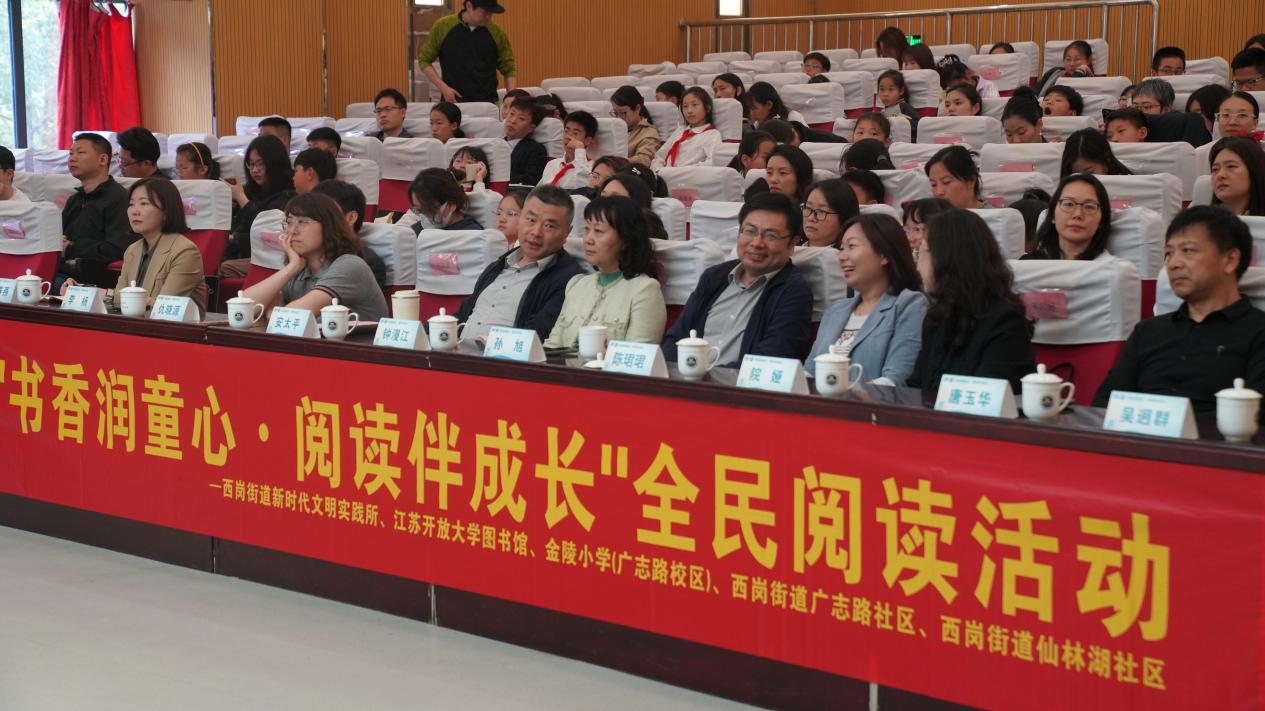 在第三十个“世界读书日”来临之际,4月21日下午,江苏开放大学图书馆、教育学院联合栖霞区委宣传部、西岗街道在南京市金陵小学(广志路校区)举办以“书香润童心 阅读伴成长”为主题的栖霞区长江文化全民阅读活动(西岗站)。此次活动通过政校社多方联动,整合优质资源,为辖区居民呈现了一场精彩纷呈的文化盛宴。